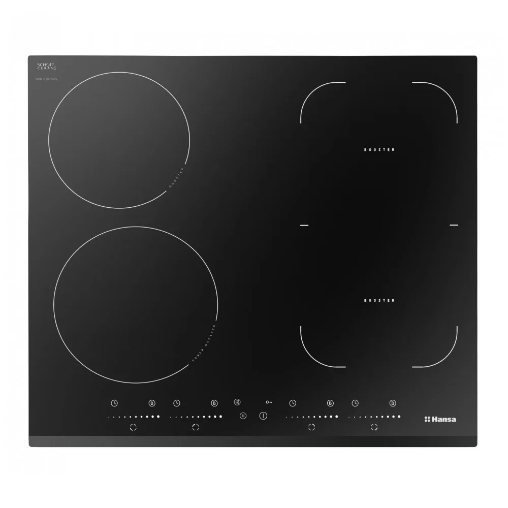 Варочная поверхность индукционная HANSA BHI68621 60см. Сенсорное управление, 4 бустера (Boosters), индикация степени нагрева, 4 таймера, функция МОСТ, блокировка управления, скошенное стекло спереди, цвет - черный.