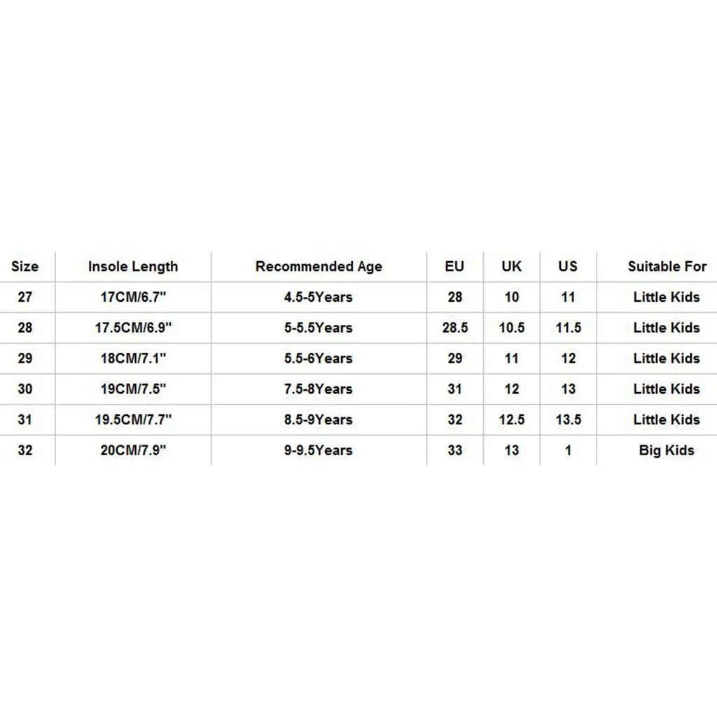 Размер Стельки Длина Рекомендуемый возраст ЕС Великобритания Свяжитесь с нами Подходит для 27 17 см/6,7" 4,5-5 лет 28 10 11 Дети дошкольного возраста 28 17,5 см/6,9" 5-5.5Years 28,5 10,5 11,5 Дети дошкольного возраста 29 18 см/7,1" 5,5-6 лет 29 11 12 Дети дошкольного возраста 30 19 см/7,5" 7,5-8 лет 31 12 13 Дети дошкольного возраста 31 19,5 см/7,7" 8,5-9 лет 32 12,5 13,5 Дети дошкольного возраста 32 20 см/7,9" 9-9.5Years 33 13 1 Дети младшего школьного возраста