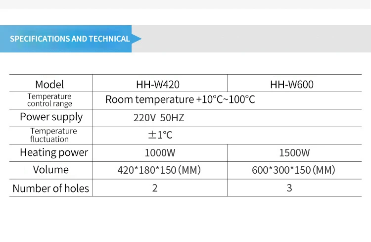 Модель: HH-W420 (2 отверстия)/HH-W600 (3 отверстия) Диапазон контроля температуры: 10 ° C -100 ° C Напряжение: 220V Колебания температуры: ± 1 °C Мощность нагрева: 1000 Вт/1500 Вт Размер студии: 420 мм * 180 мм * 150 мм/600 мм * 300 мм * 150 мм Количество отверстий: 2/3