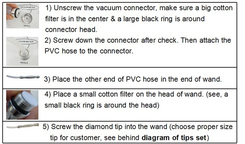 Посылка в комплекте Алмазная дермабразия машина X 1 ПВХ вакуумный шланг 6*4X1 Палочки из нержавеющей стали X 2 Алмазными наконечниками X 9 Хлопковый фильтр X 2 упаковки (1 большой, 1 маленький) Бытовой распылитель х 2 Стекло вакуум-экстрактор X 3 Шланги для распыления и вакуума (черный и красный) Мощность шнур X 1 Резиновые кольца и предохранители Полное детальное руководство/инструкции на английском языке Технические характеристики Напряжение: 100-240 В Мощность: 22W Размер упаковки: 30*26*24 см Вес брутто: 2,2 кг