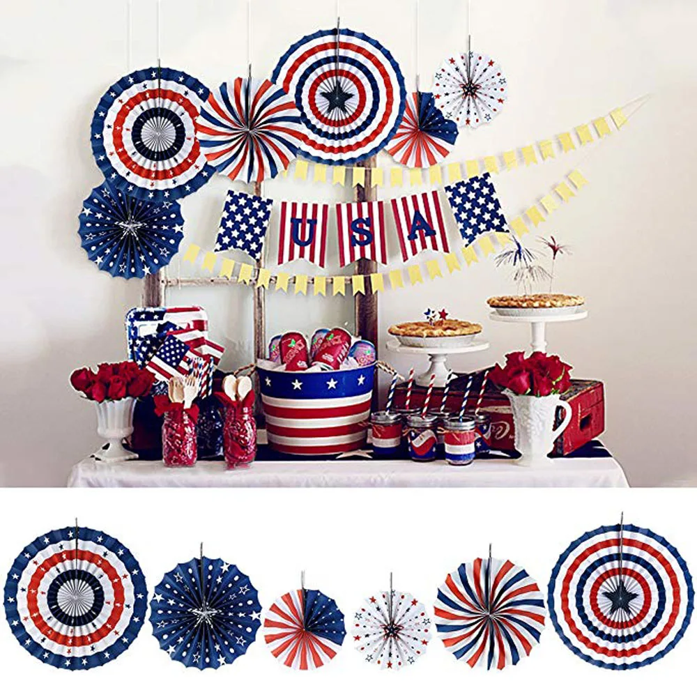 Красивые и Патриотические фанаты круговой бумаги. Шесть красных, белых и синих фанатов в 9 различных дизайнах звезд и полос и три размера (8 ", 12" и 16 ") для использования в качестве подвесных украшений.