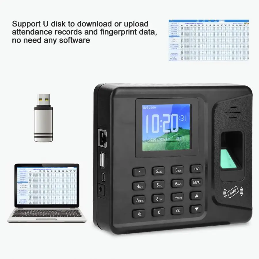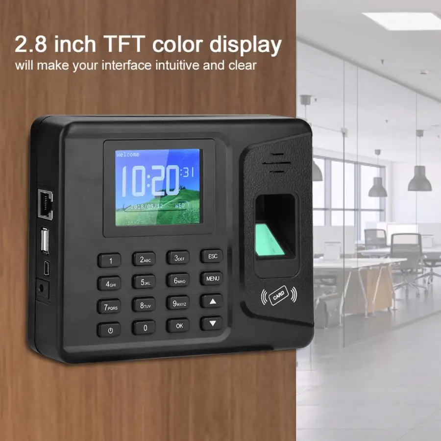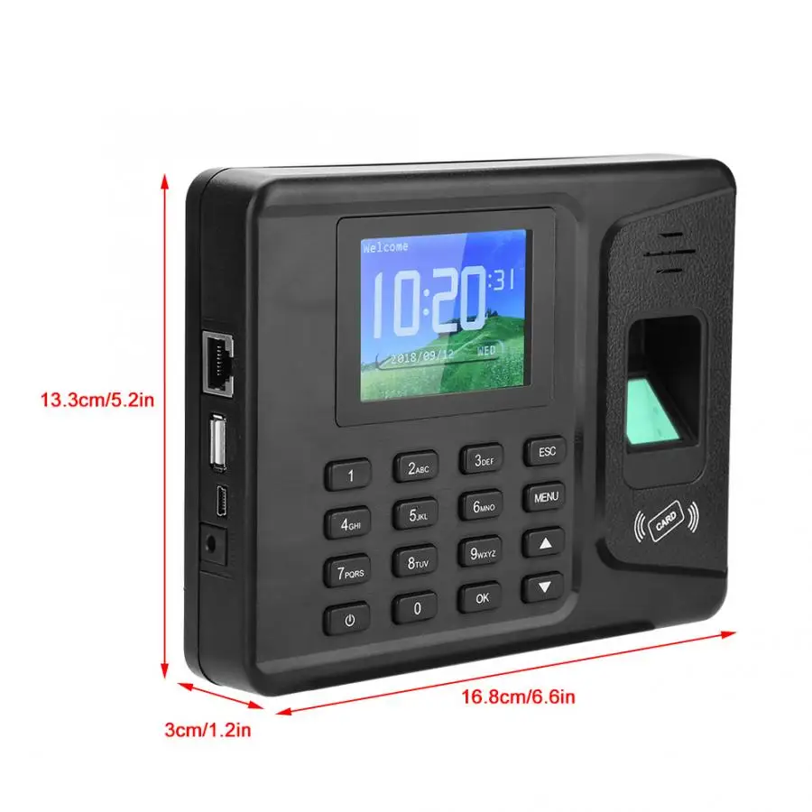 Эта машина с ЖК-экраном 2,8 дюйма использует передовую технологию идентификации отпечатков пальцев, которая эффективно устраняет проблемы идентификации отпечатков пальцев, вызванные неясностью отпечатков пальцев или повреждениями пальцев. Благодаря своей чувствительности и эффективности, это поможет вам избежать беспокойства о работе с записями посещаемости для сотрудников.