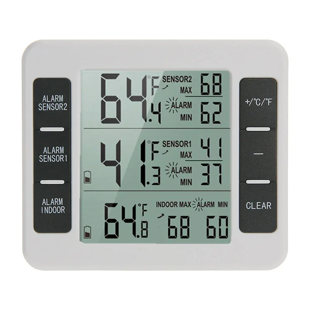 1. Этот термометр может использовать один или два датчика в соответствии с требованиями. Датчик может быть помещен в холодильник. Термометр можно использовать для контроля температуры в помещении и температуры холодильника одновременно в гостиной или комнате.