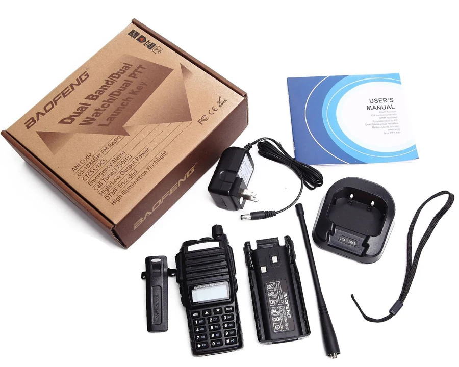 Двухдиапазонный портативный трансивер с функцией ЖК-дисплея.Коммерческий fm-радиоприемник (65 МГц ~ 108 МГц).Частотный режим/Режим канала.Кодированный DTMF.Включает 105 кодов "DCS" и 50 кодов конфиденциальности "CTCSS" программируемые.6 выбираемых шагов частоты (2,5/5/6.25/10/12.5/20/25 кГц)Функция VOX(vioce управляемая передача).Функция аварийной сигнализации.До 128 каналов памяти.Широкополосный (широкий)/Узкий (узкий) выбор.Высокая мощность (5 Вт)/низкая мощность (1 Вт) выбирается.Подсветка дисплея и программируемая клавиатура.Программируется ПК.Встроенный светодиодный фонарик.Встроенный RX CTCSS/DCX сканирование.Функция экономии батареи.Характеристики:Тип: двухдиапазонный приемопередатчикБренд: BAOFENGМодель: UV-82Цвет: черныйЧастота: VHF136-174MHz / UHF400-520MHz (двухдиапазонный)Канал: 128 каналов памятиМощность: ≤ 5 ВтНапряжение: DC7.4VСтабильность частоты: ± 2,5 ppmРабочая температура: -20 ℃-+ 50 ℃Сопротивление антенны: 50 ΩАккумулятор: литий-ионный аккумулятор 2800 мАчРазмер изделия: прибл. 12*6*3,5 см/4,7*2,4 * 1.4inВес изделия: прибл. 226 г/7,97 унцийРазмер посылка: около 21*17,5*6 см/8,3*6,9 * 2.4inВес посылка: около 495g/17,45 ozПосылка:2X Baofeng UV-822X аккумулятор2х зарядный адаптер2X настольная зарядка2X Зажим для ремня2X антенна2X Ручной слинг2X Руководство пользователя