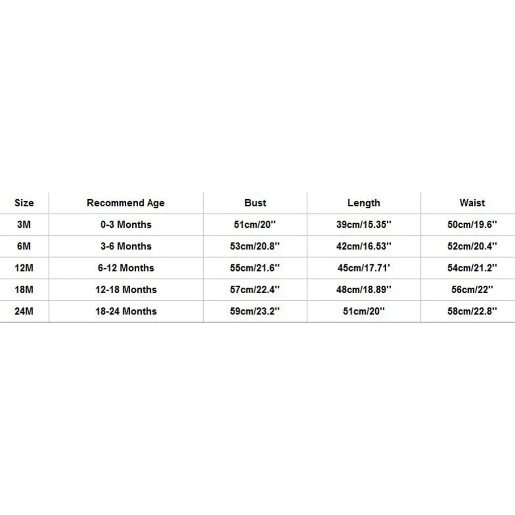 SizeRecommend AgeBustLengthWaist3M0-3 Months51cm/20''39cm/15.35''50cm/19.6''6M3-6 Months53cm/20.8''42cm/16.53''52cm/20.4''12M6-12 Months55cm/21.6''45cm/17.71'54cm/21.2''18M12-18 Months57cm/22.4''48cm/18.89''56cm/22''24M18-24 Months59cm/23.2''51cm/20''58cm/22.8''