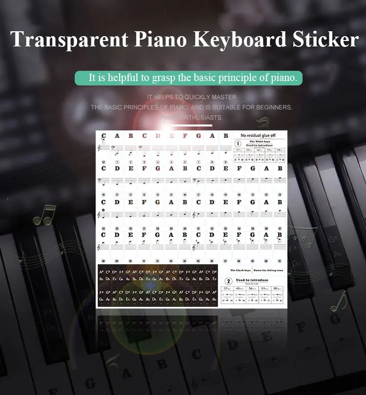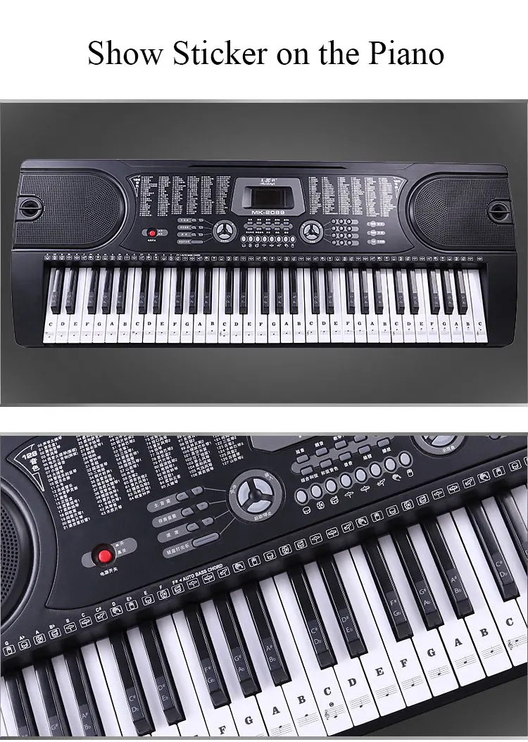 Состояние: 100% новый Материал: прозрачный ПВХ Особенность: прозрачный и съемный Подходит для: фортепиано, электронный орган, ручное пианино Количество клавиш: 37/49/54/61/88 клавиши пианино Особенности: Когда этикетки больше не требуются, вы можете удалить их. Руководство по размещению доступно. Отлично подходит для начинающих, чтобы узнать основные основы о клавишах пианино. Идеальное помощь для тех, кто увлекается изучением фортепиано и клавиатуры. Упаковка: 1 * Наклейка на клавиатуру