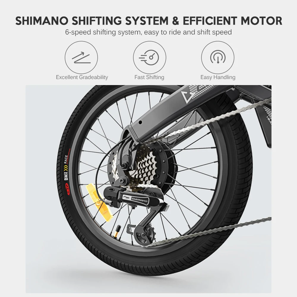 Этот электрический велосипед изготовлен из алюминиевого сплава, достаточно прочный, чтобы поддерживать максимальный вес пользователя 100 кг. Велосипед оснащен мощным мотором мощностью 250 вт, максимальной скоростью 25 км/ч, системой переключения передач shiman0 и двойной тормозной системой. Благодаря складной конструкции этот электрический велосипед очень удобен для поездок.