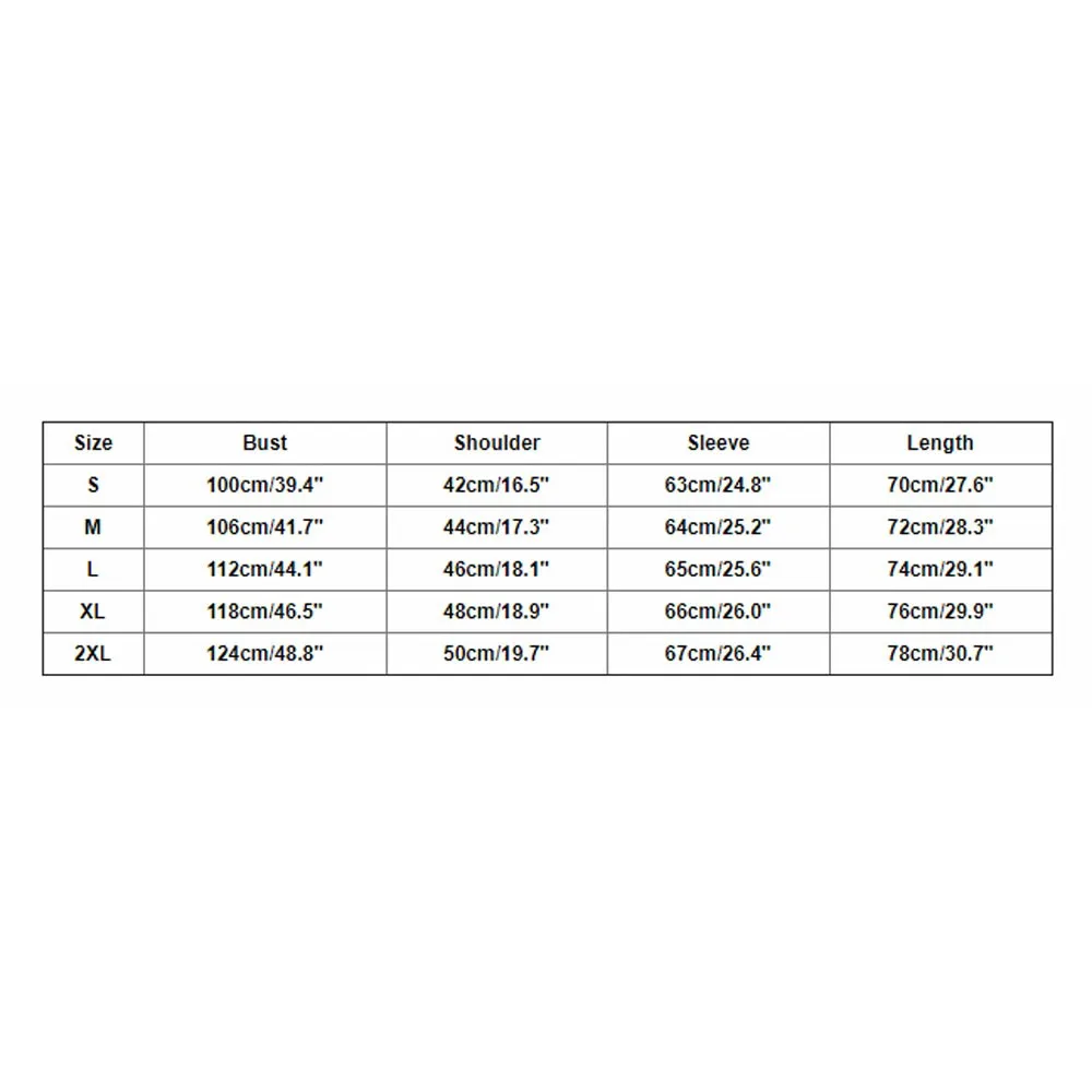 РазмерБюстПлечоРукавДлинаS100 см/39,4"42 см/16,5"63 см/24,8"70 см/27,6"М106 см/41,7"44 см/17,3 дюйма64 см/25,2"72 см/28,3 дюймаL112 см/44,1"46 см/18,1"65 см/25,6"74 см/29,1"XL118 см/46,5"48 см/18,9"66 см/26,0"76 см/29,9"2XL124 см/48,8"50 см/19,7"67 см/26,4 дюйма78 см/30,7"Размер: SБюст: 100 см/39,4"Ширина плеч: 42 см/16,5 дюймаРукав: 63 см/24,8"Длина: 70 см/27,6"Размер: MБюст: 106 см/41,7"Плечо: 44 см/17,3 дюймаРукав: 64 см/25,2"Длина: 72 см/28,3"Размер: LБюст: 112 см/44,1"Плечо: 46 см/18,1"Рукав: 65 см/25,6"Длина: 74 см/29,1"Размер: XLБюст: 118 см/46,5"Плечо: 48 см/18,9"Рукав: 66 см/26,0"Длина: 76 см/29,9"Размер: 2XLБюст: 124 см/48,8"Плечо: 50 см/19,7"Рукав: 67 см/26,4"Длина: 78 см/30,7"