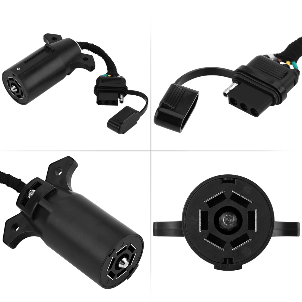 American Style 7 to 4 Pin Trailer Adapter. Vehicle end 7 pin round RV style connector to trailer end 4 pin flat plug. Easy to install the adaptor between the trailer cord and the tow vehicle plug. Includes weatherproof dust cover. Safe and dependable performance, reasonable design.