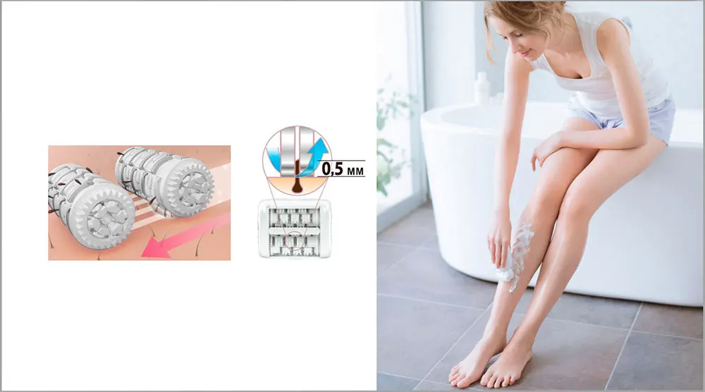 Протектор удерживает кожу неподвижной, так что эпилятор удаляет волоски, не затягивая кожу. Процедура безболезненна, результат долговечен.