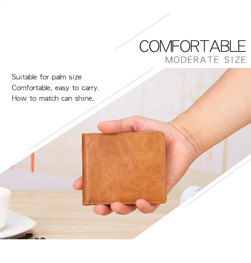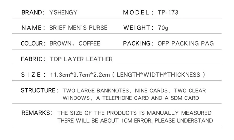 Дизайн: мужской кошелек из натуральной кожи Материал: первый слой воловьей кожи Размер: 11,3 (ширина) * 9,7 (высота) * 2,2 (толщина) см Цвет: коричневый/оранжевый Вес нетто: 0,07 кг Примечание 1: 1 дюйм = 2,54 см, 1 см = 0,39 дюймов Примечание 2: цвет может немного отличаться из-за настроек монитора компьютера. Примечание 3: с различием в способе измерения, пожалуйста, допускайте отклонение в размере 1-3 см.