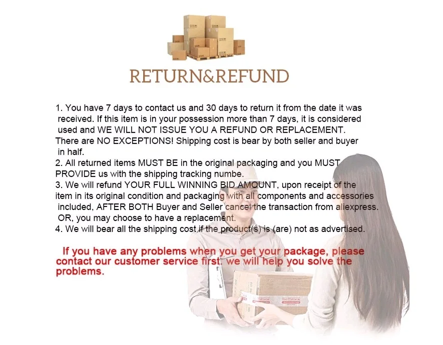 7) Если вы не получили посылку в течение 39 дней с момента оплаты, пожалуйста, свяжитесь с нами. Мы отследим отправку и свяжемся с вами как можно скорее. Наша цель – удовлетворение клиентов!