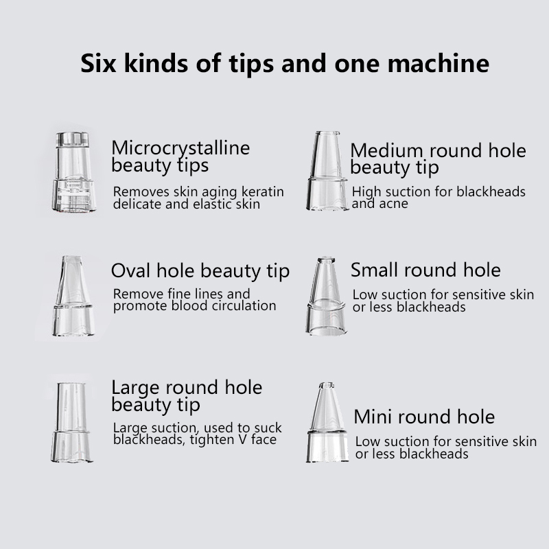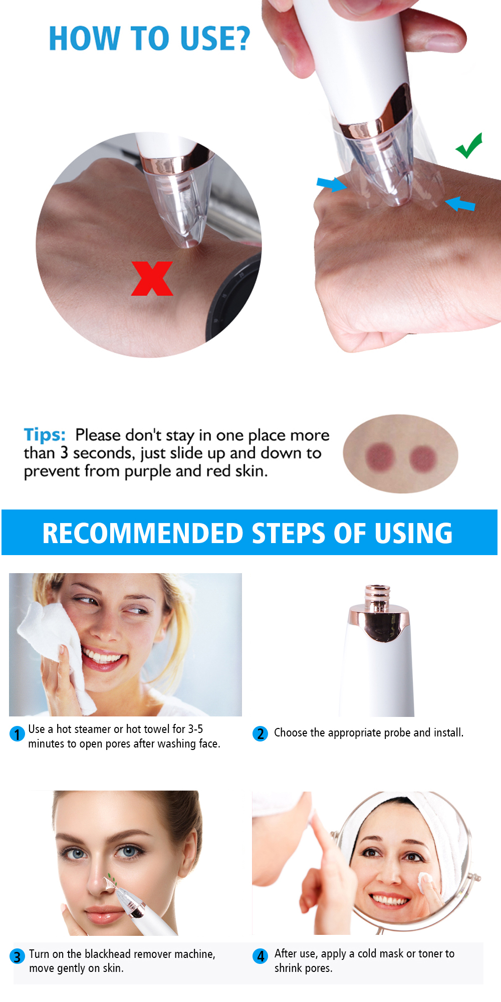 Советы: ✔Пожалуйста, не всасывайте на одной и той же области все время, это сделает кожу набухшей. Если кожа разбухнет, немедленно прекратите использование. ✔Перед использованием продукта используйте горячий отпариватель или горячее полотенце или гель/Крем для удаления угрей на коже в течение 5 минут, чтобы полностью открыть поры, чтобы обеспечить наилучшую производительность продукта. ------------------------------------------------------------------------------------------------------ Как использовать? Шаг 1: очистите лицо, используйте отпариватель для извлечения черных точек или отпариватель для лица, чтобы открыть пор. Шаг 2: согласно вашим требованиям, выберите один из пяти уровней всасывания. Начните с самого низкого. Шаг 3: перемещайте моющее средство с Черной головкой назад и вперед вокруг пор с постоянной скоростью, медленно двигайтесь, Не оставайтесь в одном месте слишком долго, чтобы избежать травм, не нажимайте и не тяните вертикально. Шаг 4: после мытья лица, пожалуйста, используйте ледяное полотенце или холодную воду или сжимающую жидкость, чтобы восстановить очищенную пору.