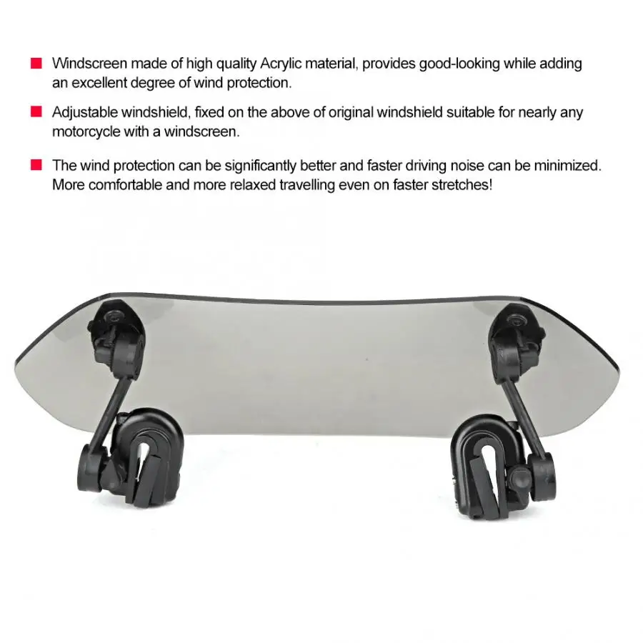 Регулируемое лобовое стекло, закрепленное на верхней части оригинального лобового стекла, подходит практически для любого мотоцикла с лобовым стеклом.