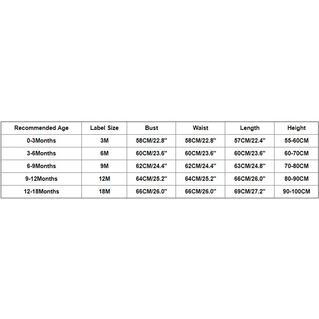 Рекомендуемый возраст Этикетка Размеры Обхват груди Обхват талии Длина Высота От 0 до 3 месяцев 3 м 58 см/22,8'' 58 см/22,8'' 57 см/22,4'' 55-60 см От 3 до 6 месяцев 6 м 60 см/23,6'' 60 см/23,6'' 60 см/23,6'' 60-70 см От 6 до 9 месяцев От 9 месяцев 62 см/24,4'' 62 см/24,4'' 63 см/24,8'' 70-80 см 9 to 12months Размеры от 12 мес. Высота голенища 64 см; 25,2'' Высота голенища 64 см; 25,2'' 66 см/26,0'' Рост 80-90 см 12-18Months 18M 66 см/26,0'' 66 см/26,0'' 69 см/27,2'' 90-100 см