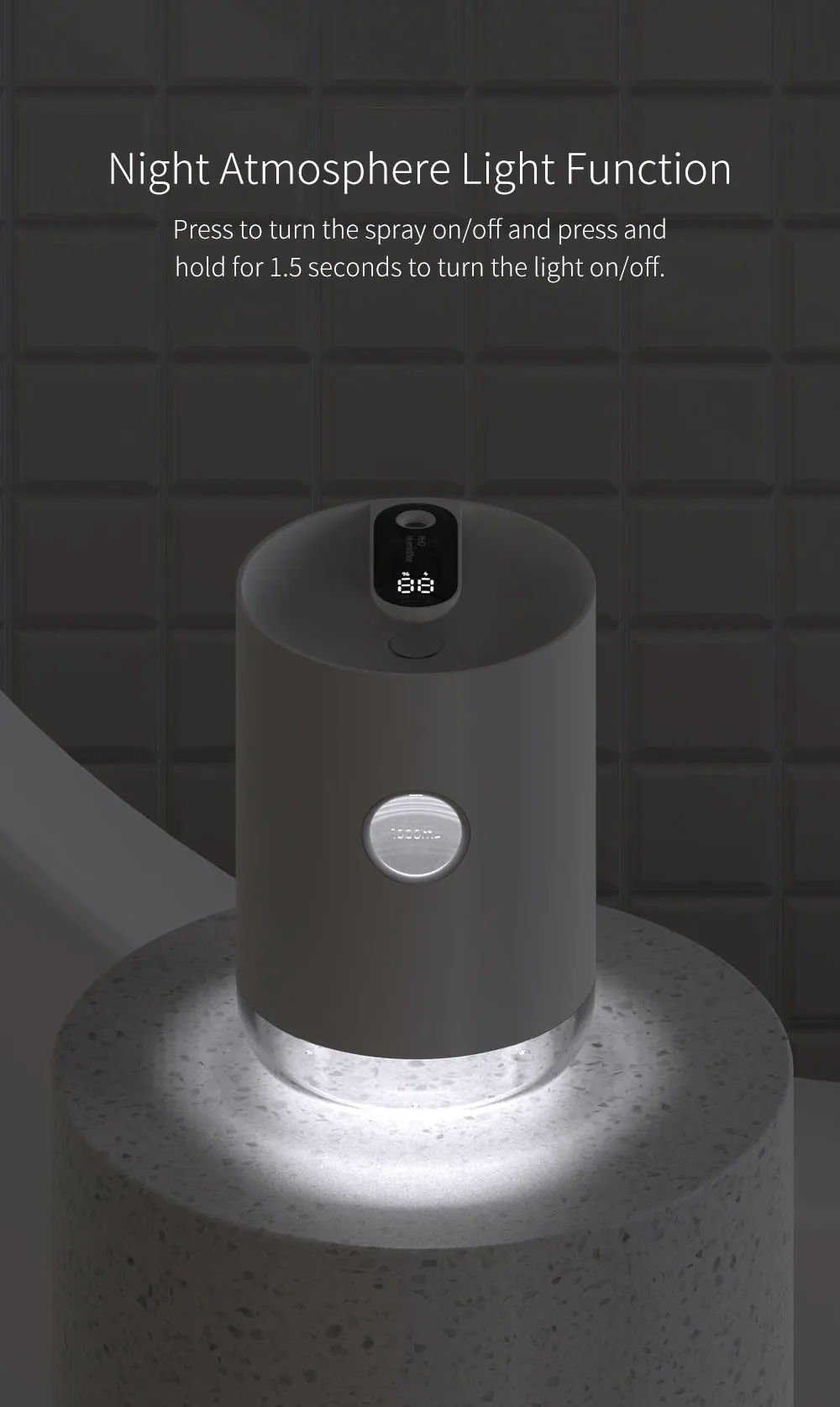 Пресс, чтобы включить спрей на включение/выключение и Пресс и удерживайте в течение 1,5 секунды, чтобы включить светильник ВКЛ/ВЫКЛ.