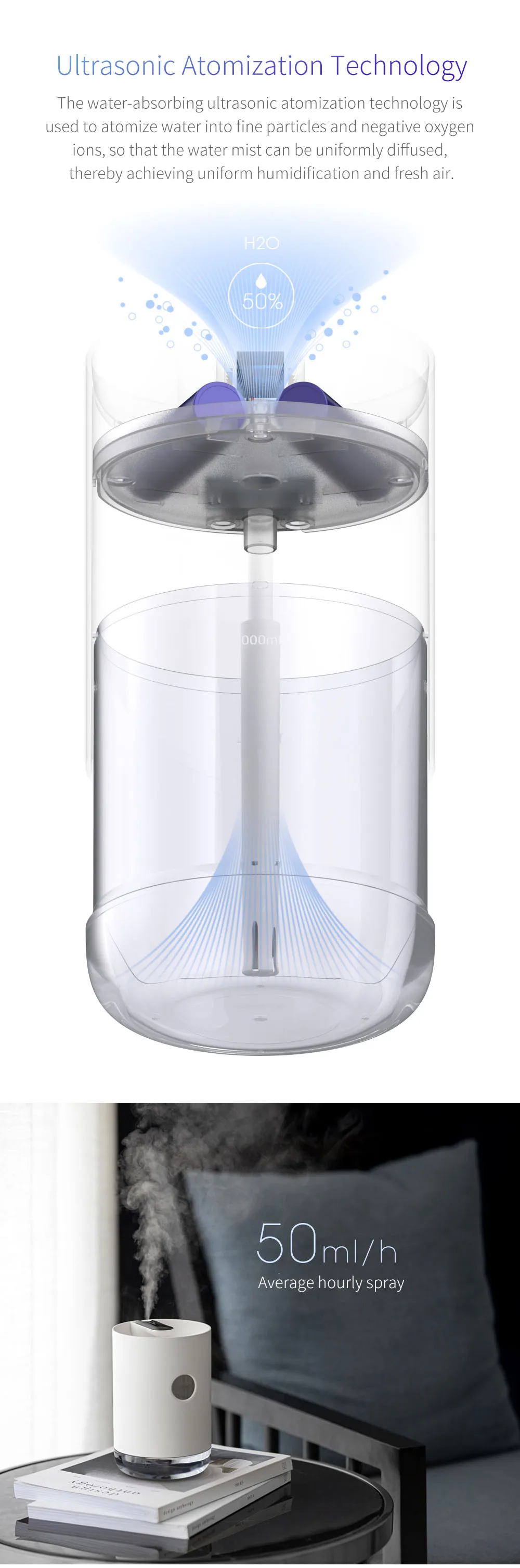 Водопоглощающая ультразвуковая технология распыления используется для распыления воды в мелкие частицы и отрицательные ионы кислорода, так что водяной туман может быть равномерно рассеян, тем самым достигая равномерного увлажнения и свежего воздуха.