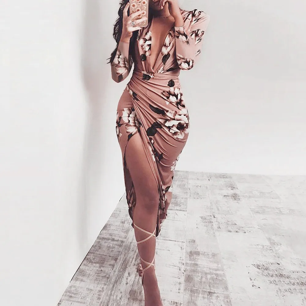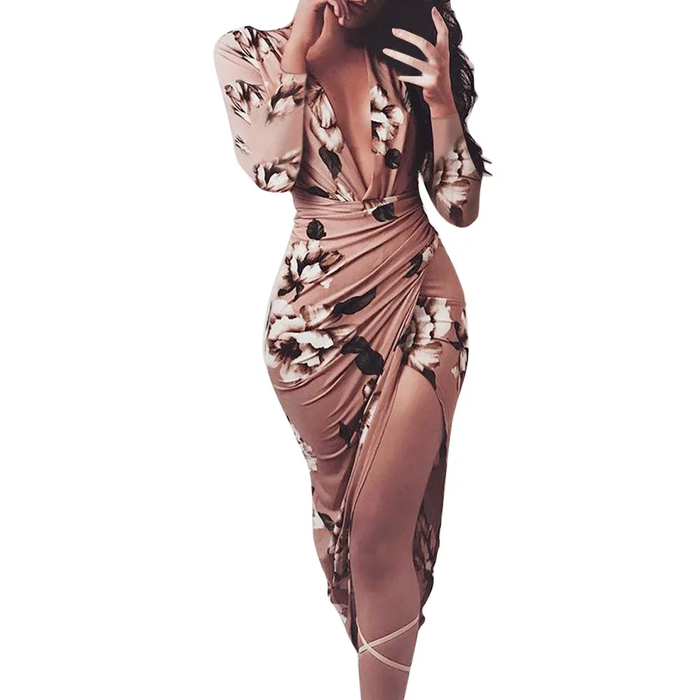 Для женщин; Сезон осень Зимнее повседневное облегающее платье с цветочным принтом и длинными рукавами