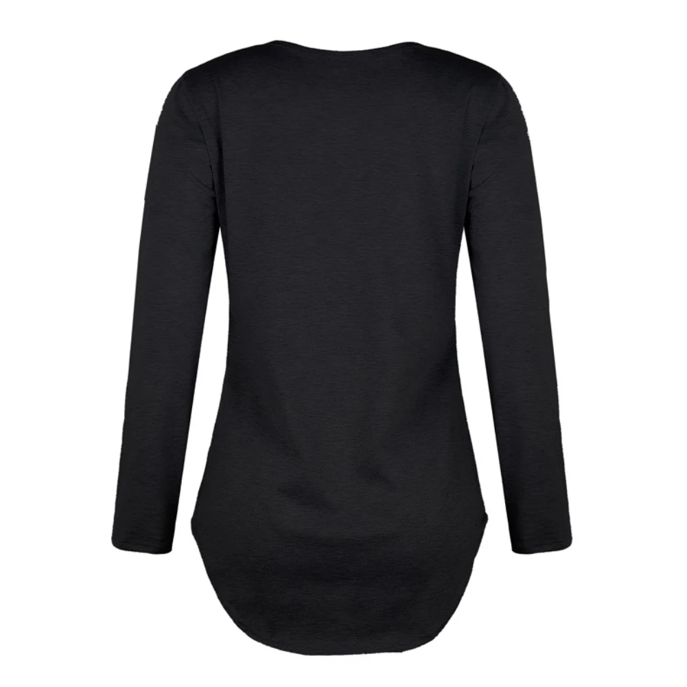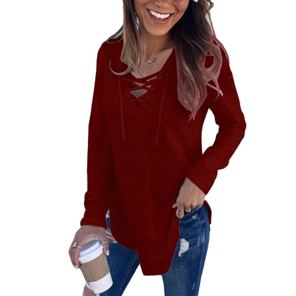 Осенняя Повседневная Женская свободная Однотонная футболка на шнуровке с v-образным вырезом и длинным рукавом