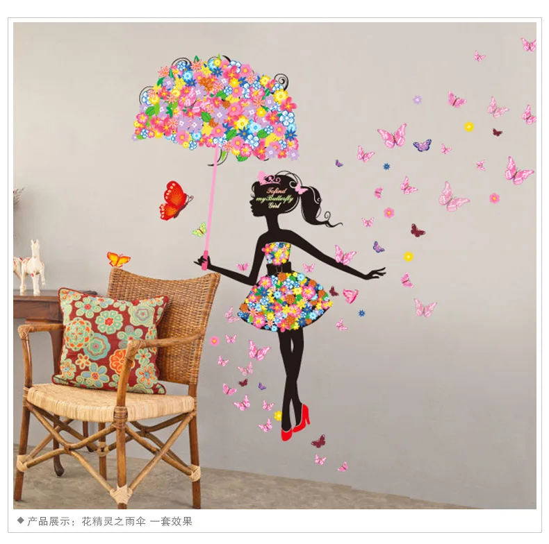 Цветок эльфа Зонтик для девочек с бабочками; Фон Наклейка на стену, романтический теплый дом украшения Стикеры