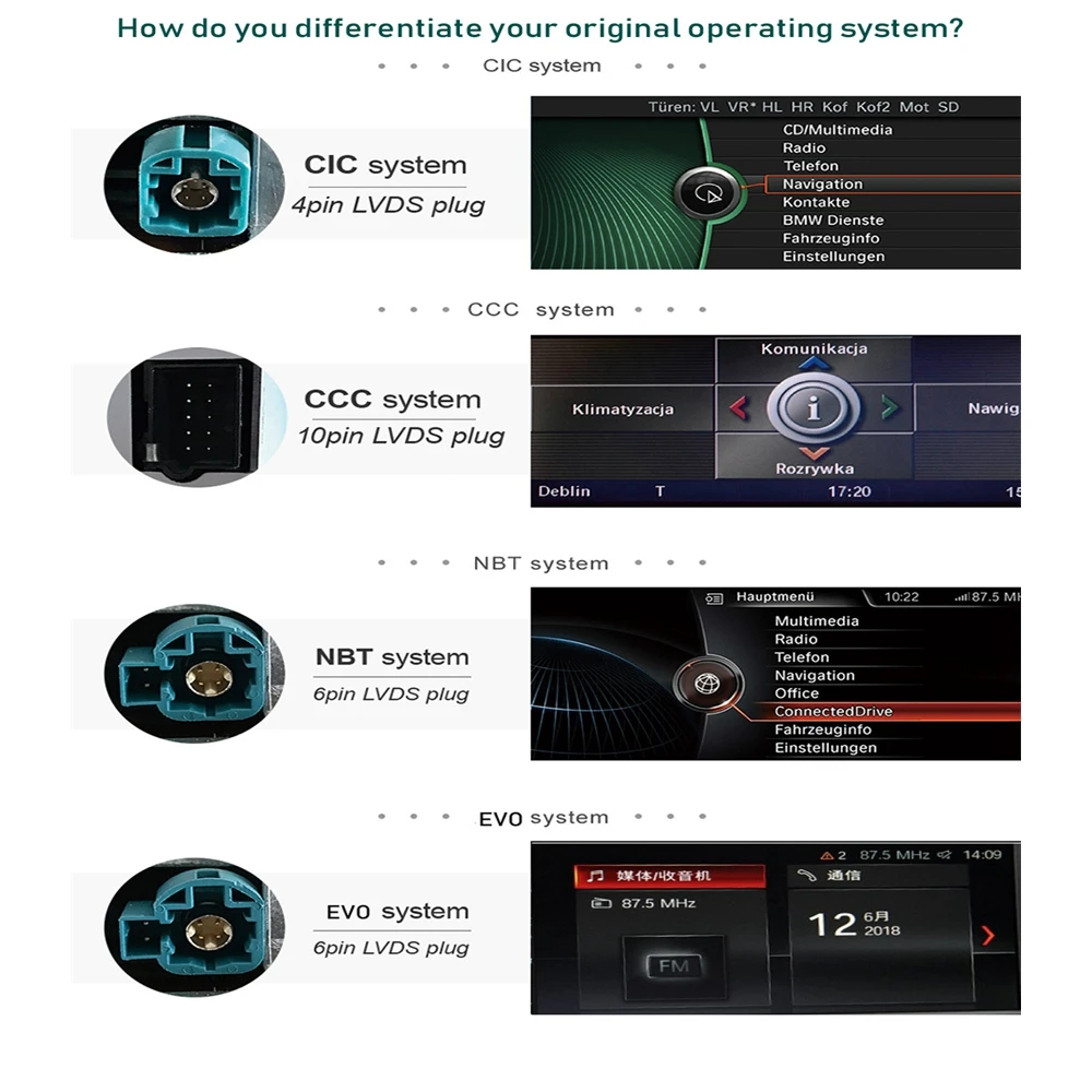 1. Дорогой друг, пожалуйста, убедитесь, что приборная панель такая же, как у нас. 2. Чтобы убедиться, что устройство подходит для вашего автомобиля, пожалуйста, отправьте нам изображение приборной панели и сообщите нам модель автомобиля и год. 3. Оригинальный автомобиль должен быть с AUX 4. Для точного определения, вам лучше отправить нам фотографию LVDS портов за радио (CCC, CIC или NBT)