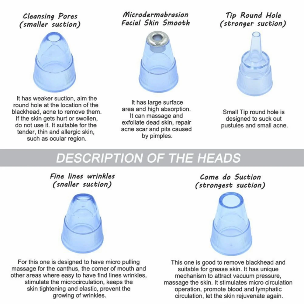 * Всасывание больше, чем традиционный всасывающий зонд comedo * Пять уровней, подходит для разной кожи * Различные всасывающие головки, различные функции * Перезаряжаемый, легкий и удобный