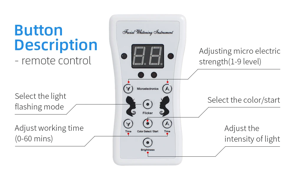 · Используйте функции контроллера ниже и выберите цвет, время и соответствующую силу микро-тока.