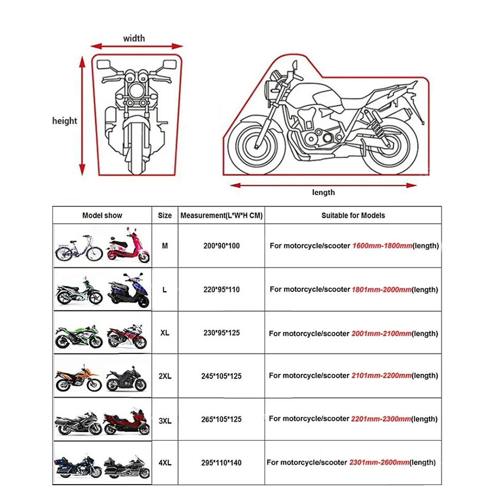 Параметры Цвет: черный + серебристый, черный, черный + камуфляж Размер: M, L, XL, XXL, XXXL, 4XL Материал: 190 T Полиэстеровая ткань с серебряным покрытием + 210D оксфордская ткань с серебряным покрытием Применимые модели: мотоцикл Особенности 1. 100% новый и высококачественный 2. Пылезащитный, водонепроницаемый, УФ-стойкий, против царапин 3. Удобно и легко хранить и носить с собой, подходит для внутреннего и наружного использования 4. Металлическая Противоугонная Пряжка, противоугонная, повышающая прочность Посылка включает в себя 1 х чехол для мотоцикла 1 х тканевая сумка