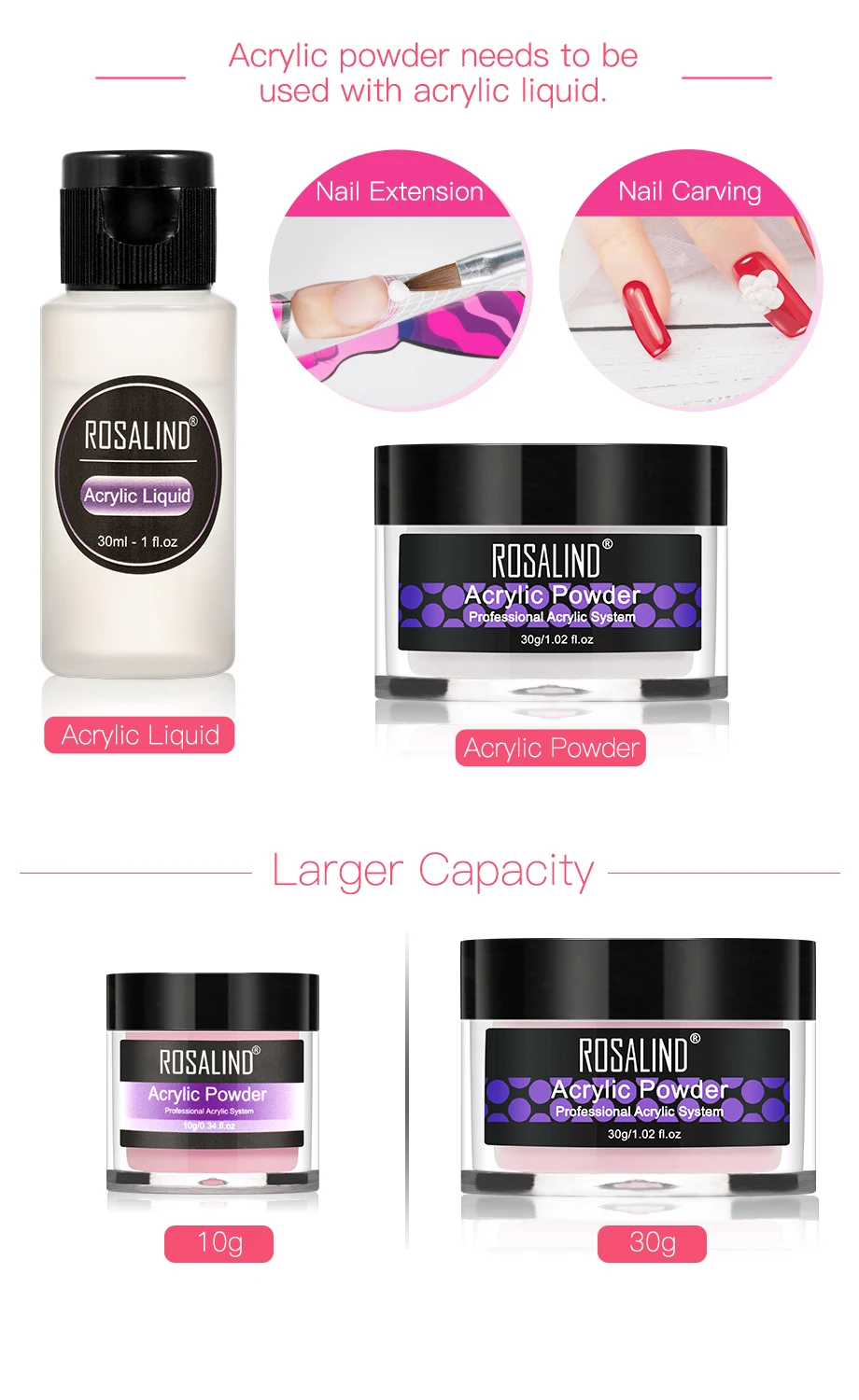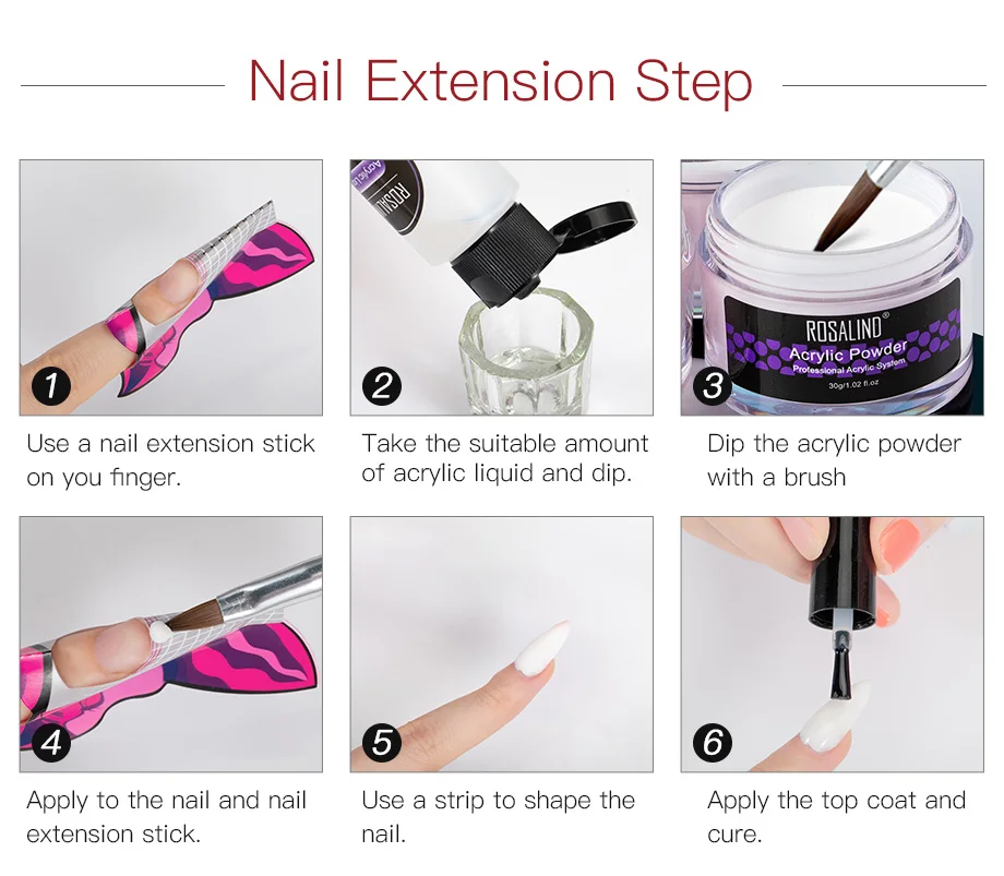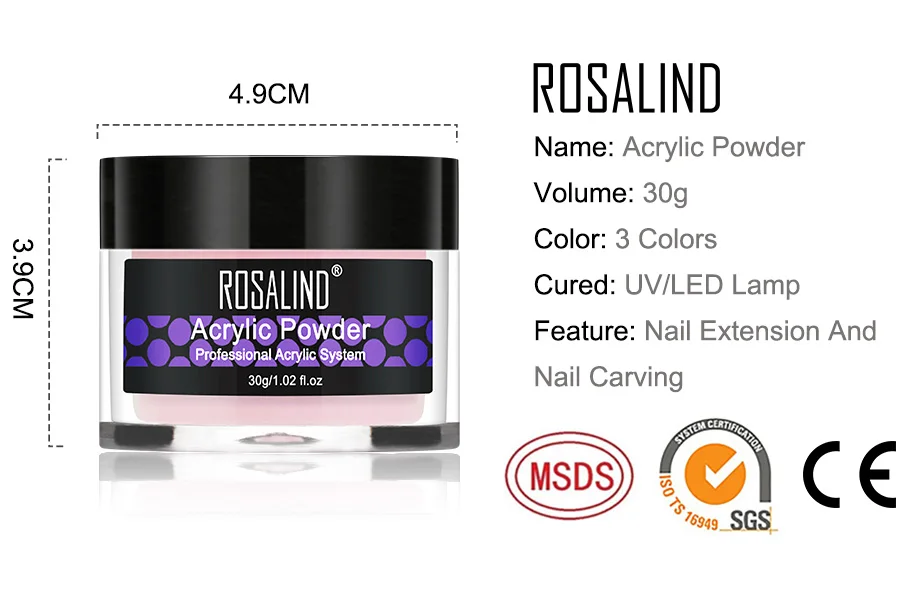 Акриловый порошок ROSALIND, Кристальный дизайн ногтей, прозрачный акриловый порошок для ногтей, маникюр 30 г, розовый, белый, прозрачный