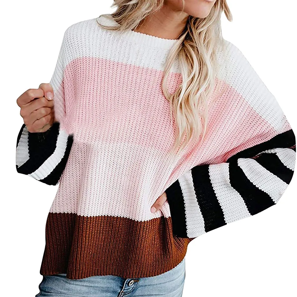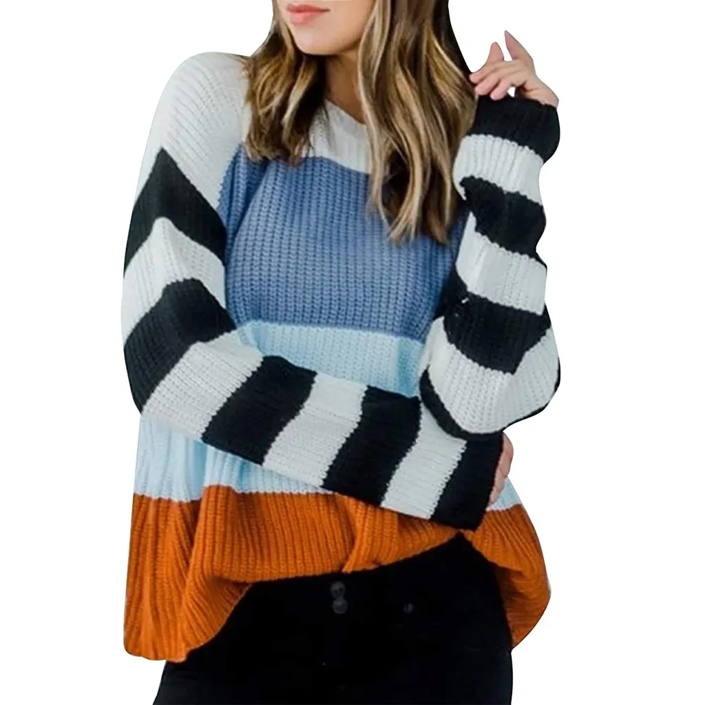 Женский свитер с круглым вырезом в полоску с цветным блоком, трикотажный пуловер в стиле пэчворк, топы