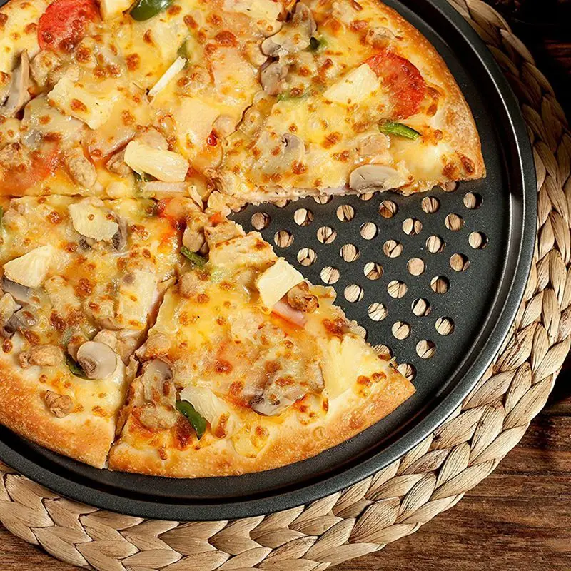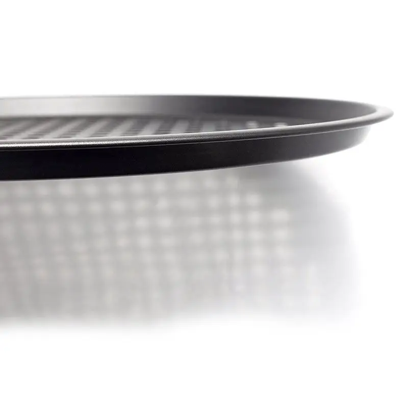 Наша сковорода для пиццы является профессиональной и новой, которая обеспечивает вентиляционные отверстия на дне сковороды. Вентиляционные отверстия помогают циркулировать воздух и обеспечивают равномерность нагрева, в отличие от традиционной кастрюли для пиццы уменьшает деликатность пиццы.