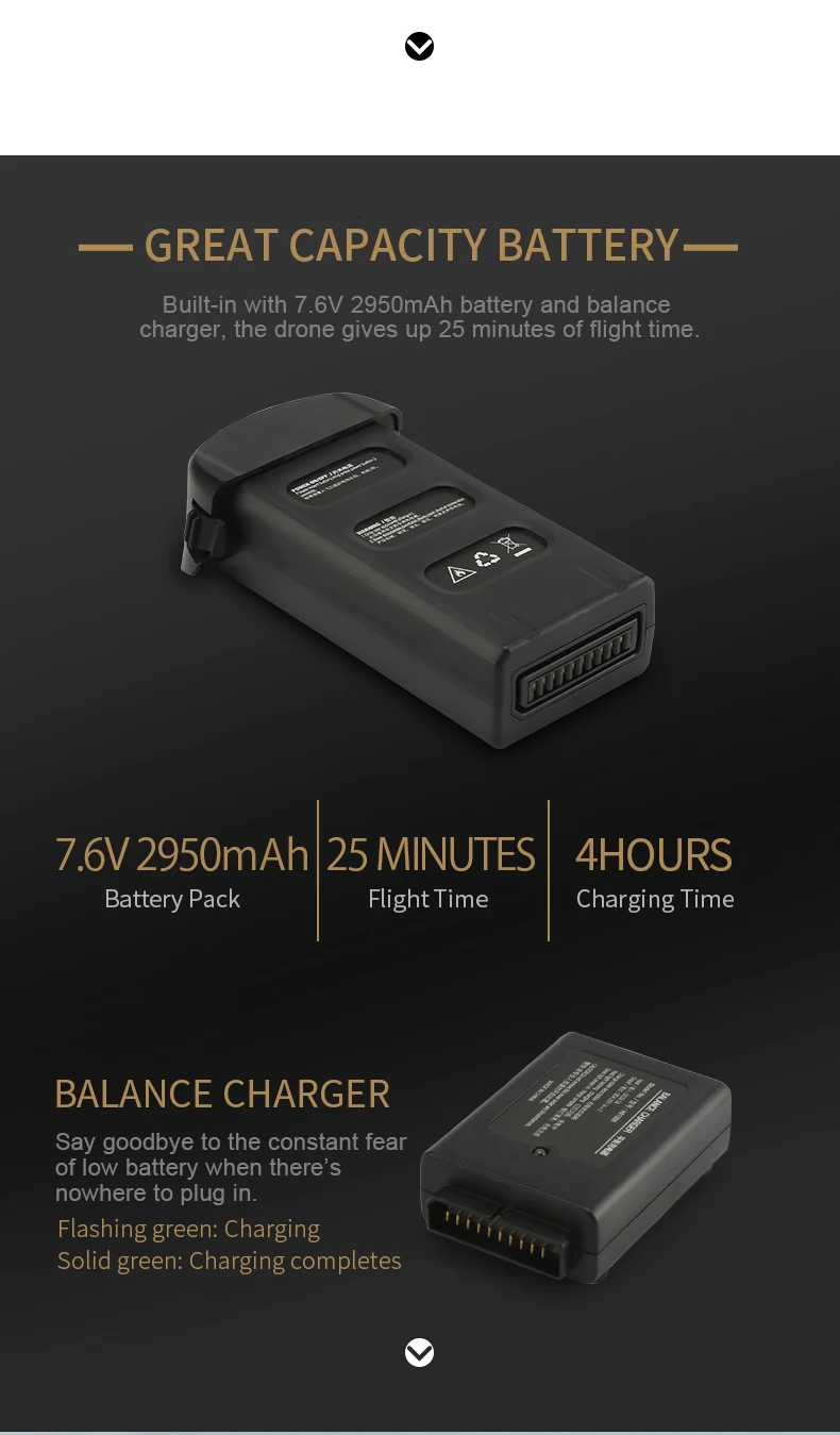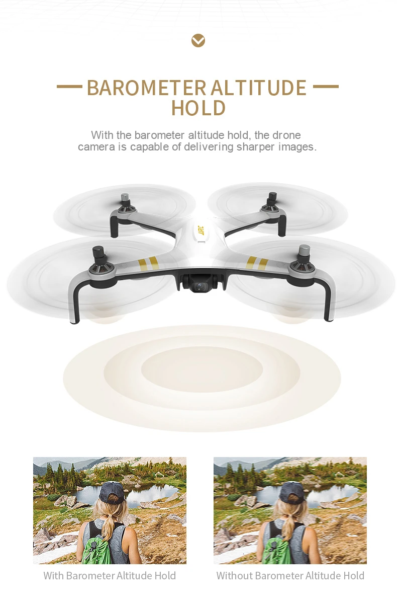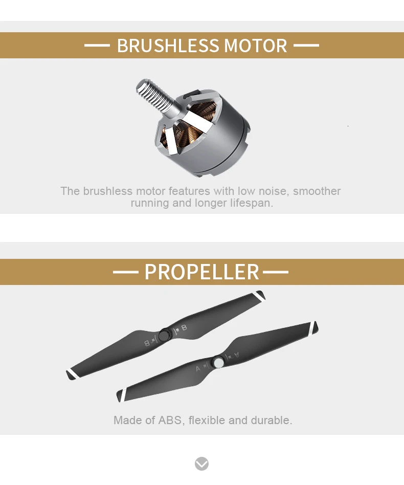 8) Two-axis Self-stabilizing Gimbal: Mounting the two-axis mechanical stabilization gimbal, you can obtain stable and clear videos and photos during the flight;