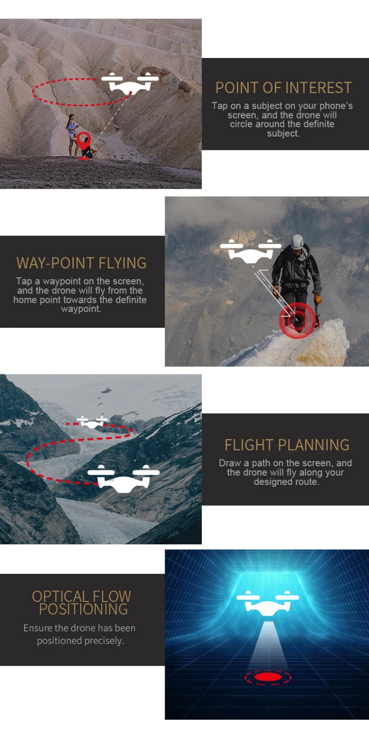 Forward/Backward,Gesture Mode/Video,GPS Location Tracking, Altitude Hold/Position Hold, Low-voltage Return to Home, Failsafe Mode, Point of Interest, Way-point Flying, Flight Planning, One Key Automatic Return,One Key Takeoff, Turn Left/Right, Up/Down,WiFi Connection, Picth Angle Adjustment, Image Rarl-time Transmission
