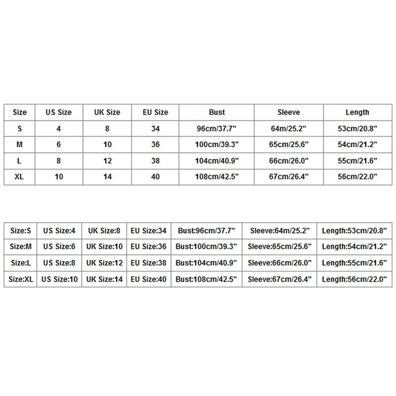 Size US Size UK Size EU Size Bust Sleeve Length S 4 8 34 96cm/37.7" 64m/25.2" 53cm/20.8" M 6 10 36 100cm/39.3" 65cm/25.6" 54cm/21.2" L 8 12 38 104cm/40.9" 66cm/26.0" 55cm/21.6" XL 10 14 40 108cm/42.5" 67cm/26.4" 56cm/22.0"
