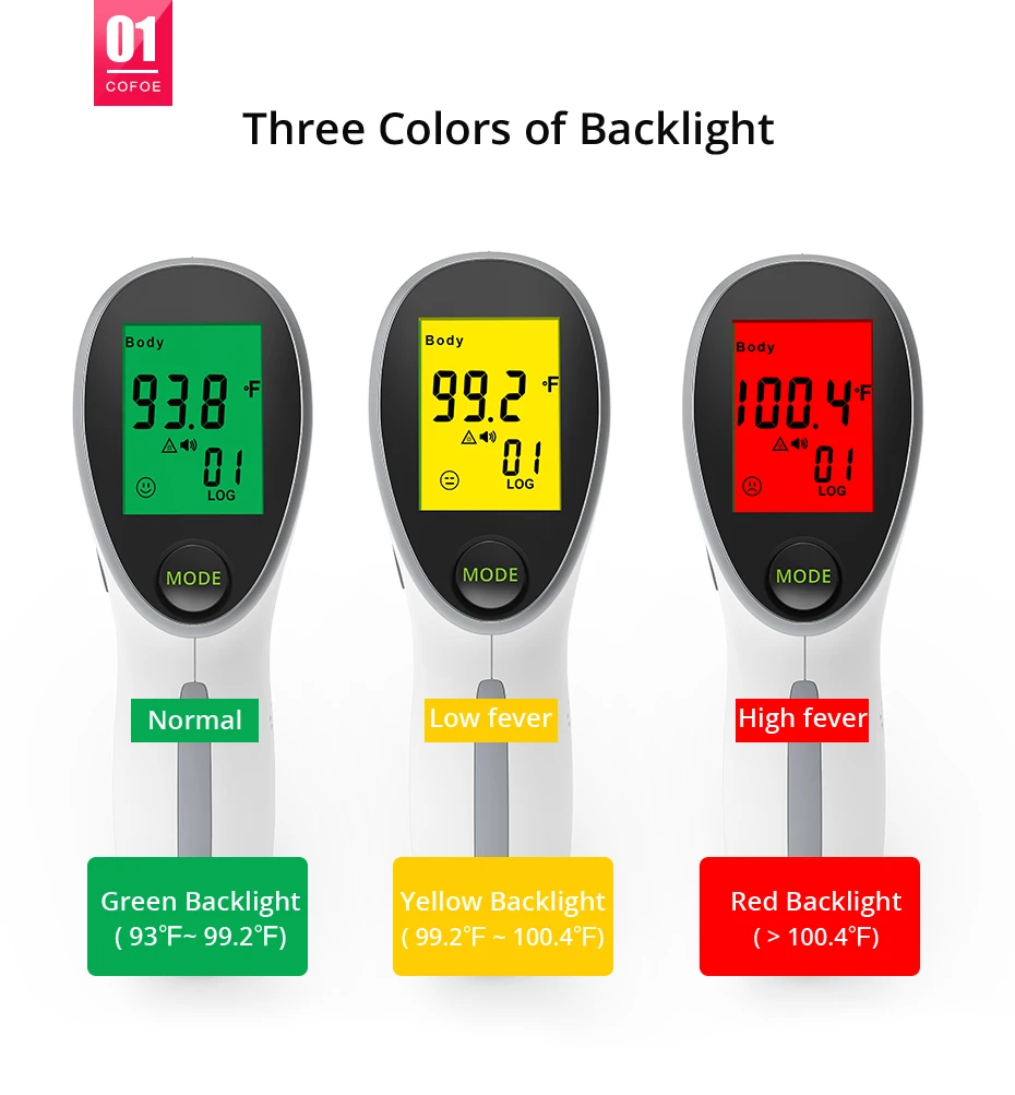 Трехцветная подсветка и сигнализация лихорадки-зеленый (ниже 37,5 C/99,5 F), желтый (37,6 C ~ 38,0 C/99,68 F ~ 100,4 F), красный (выше 38,1 C/100,58 F). Автоматическая сигнализация лихорадки при температуре выше 38 C/100,5 F.