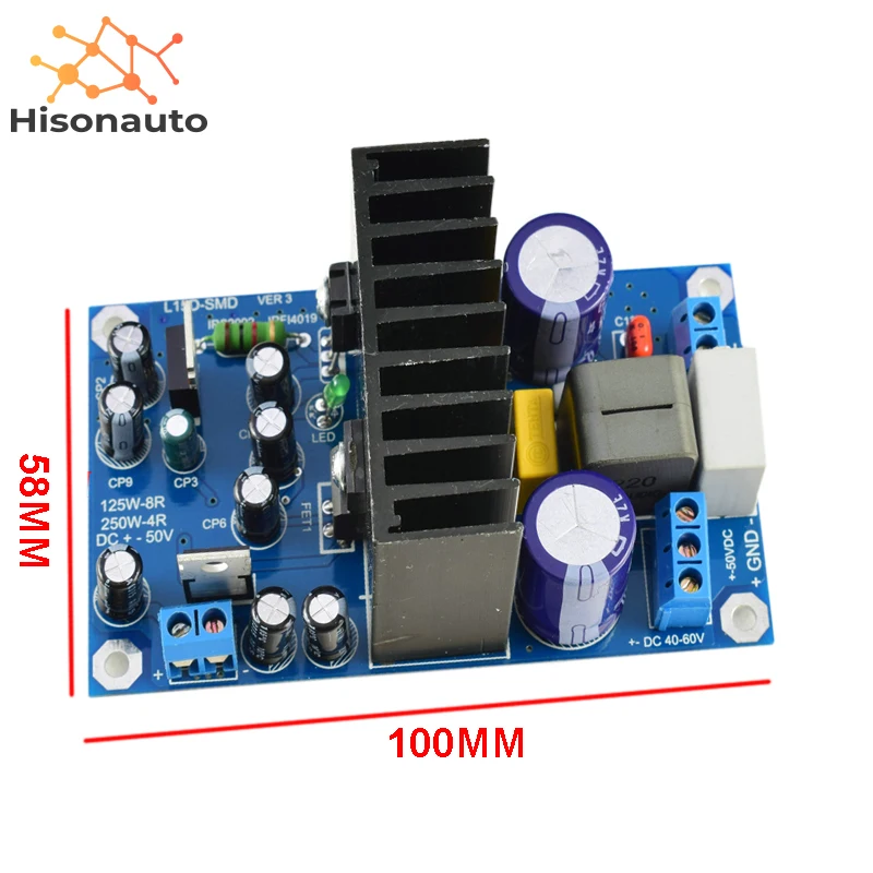 1. Используйте напряжение постоянного тока + -50 в (между + -33 в и + -55 в) 2. + -50 В выходная мощность = 125 Вт 8R RMS. 250 Вт 4R RMS. 3. Размер: длина, ширина и высота: 100 мм * 58 мм * 42 мм 4. Расстояние между монтажными отверстиями: 91,5 мм по горизонтали, вертикали 49,5 мм 5. Вес: 120 граммов 6. Искажение: 0,007% THD + N @ 60 Вт, 4 Ω 7. Усиление напряжения: 36 8. Сопротивление нагрузки: 4 Ом 9. На холостом ходу, оборот в минуту (холостой ход потребеление энергии: 7 Вт 10. Эффективность канала: 90% 250 Вт 4 Ом 11. Динамический диапазон: 101 дБ 12. Остаточный шум: 200 УФ 13. Частотная характеристика: 20 Гц-35K Гц + -3 дБ 14. Тепловые характеристики: 30 Вт, 55C по Цельсию Мощность 250 Вт, 90C по Цельсию