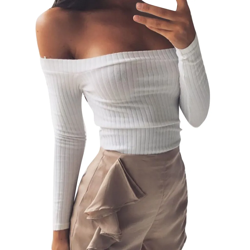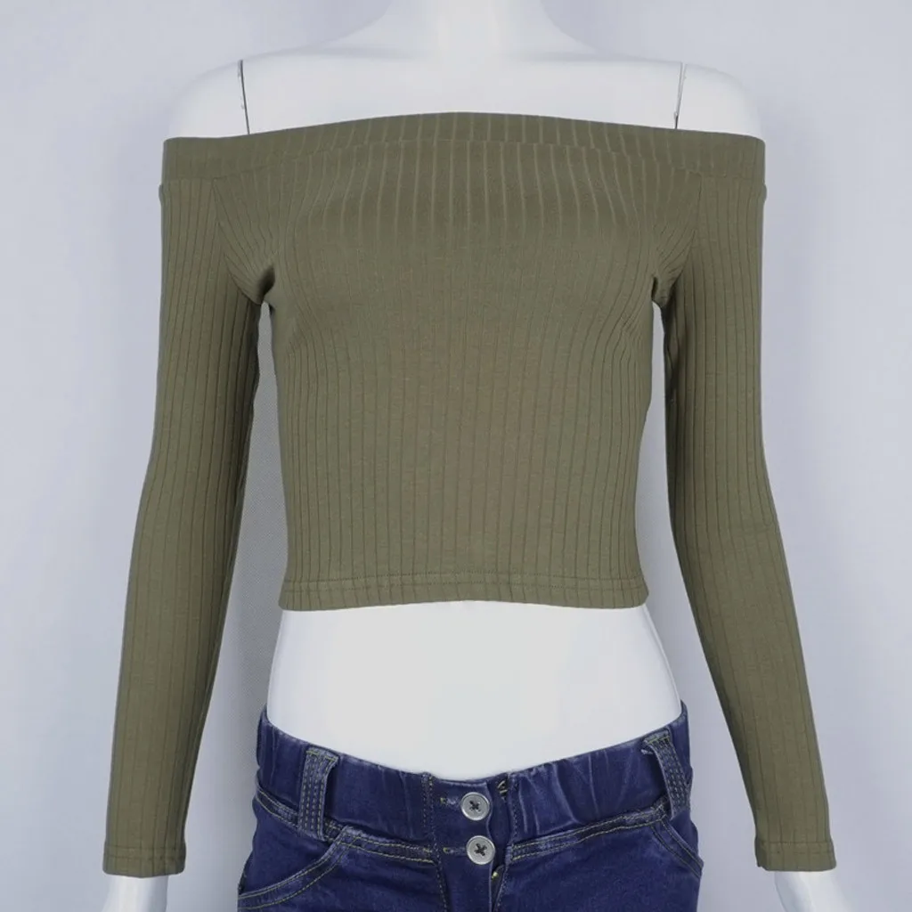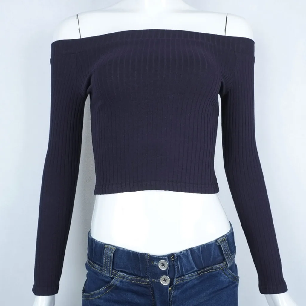 Модные женские топы с открытыми плечами и длинными рукавами; Полосатая блузка; Короткая Однотонная футболка