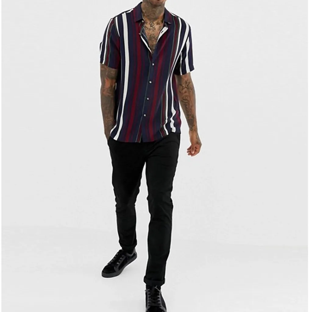 Мужская разноцветная Асимметричная футболка в полоску, с короткими рукавами и воротником на пуговицах