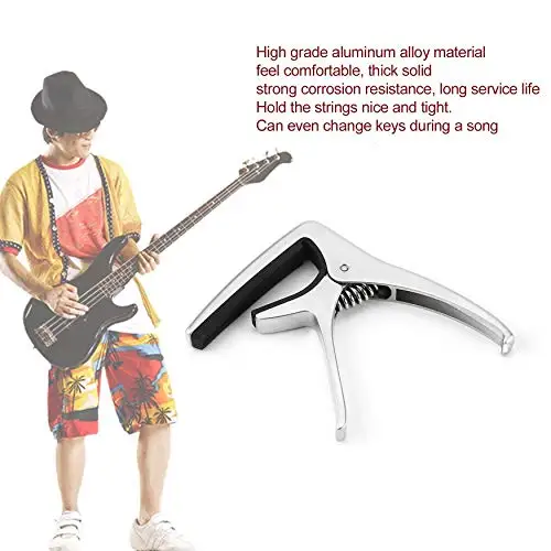 Основные характеристики: стальная пружина оказывает сбалансированное давление, чтобы убедиться, что каждая нить остается в гармонии, когда capo находится на любом ладу. Многофункциональный. Отличный инструмент, который поможет вынуть гитарные струны при обмене струнами. Прочный capo изготовлен из высококачественного сплава цинка длится весь срок службы. Отделка гладкая и роскошная. Высококачественные силиконовые прокладки для защиты вашего инструмента от повреждений или царапин. Легко и быстро использовать. Одной рукой легко нажимать, перемещать и позиционировать capo, не нарушая настройки. О товаре: Материал: металл + сталь + Силикон Цвет: серебристый Размер: 88*73*11 мм Вес: 71 г