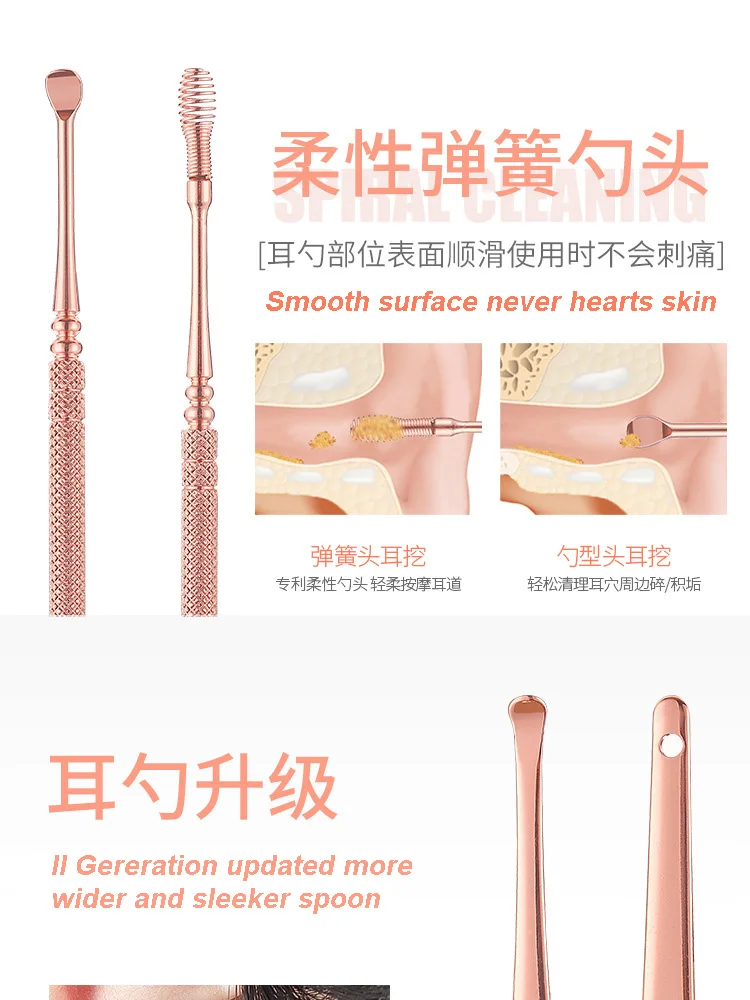 Этот набор для подбора ушей изготовлен из высококачественной нержавеющей стали, вся поверхность гладкая, полированная и закругленная, более безопасная для очистки уха. Может быть приятным подарком для вашей семьи и друзей