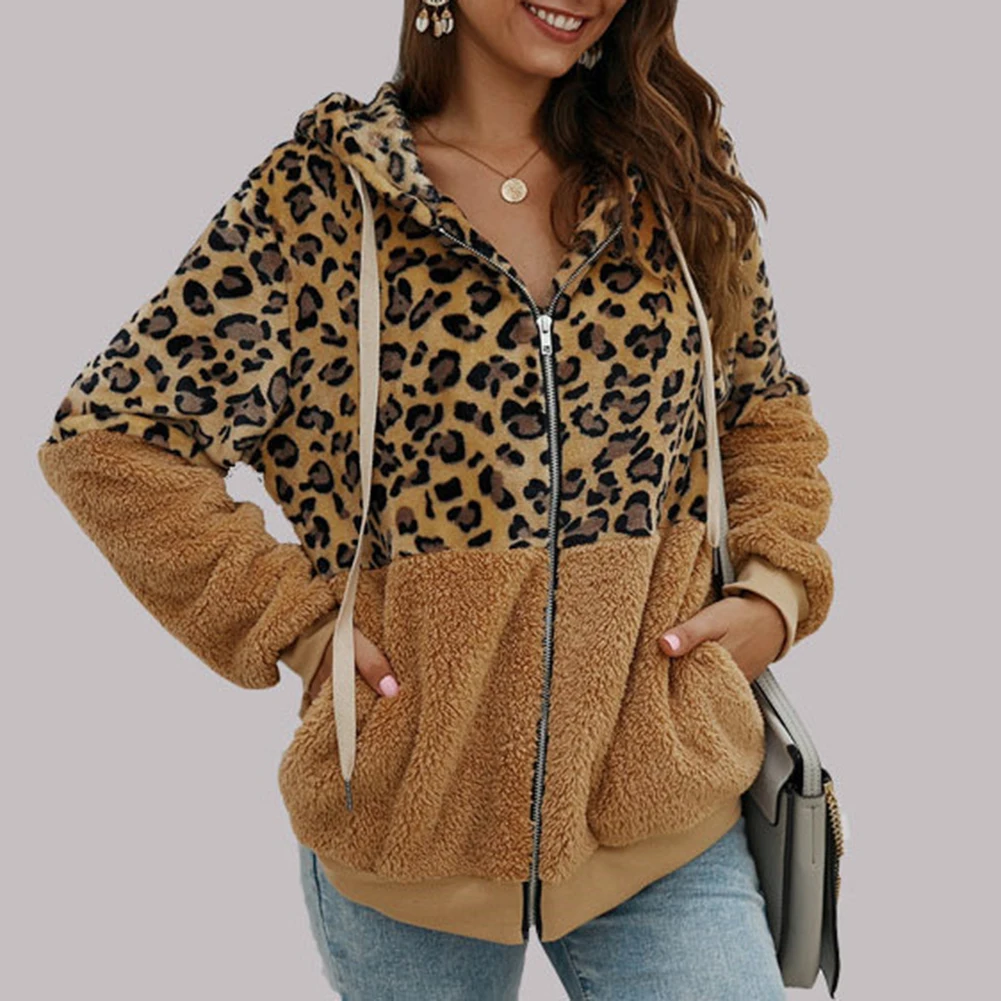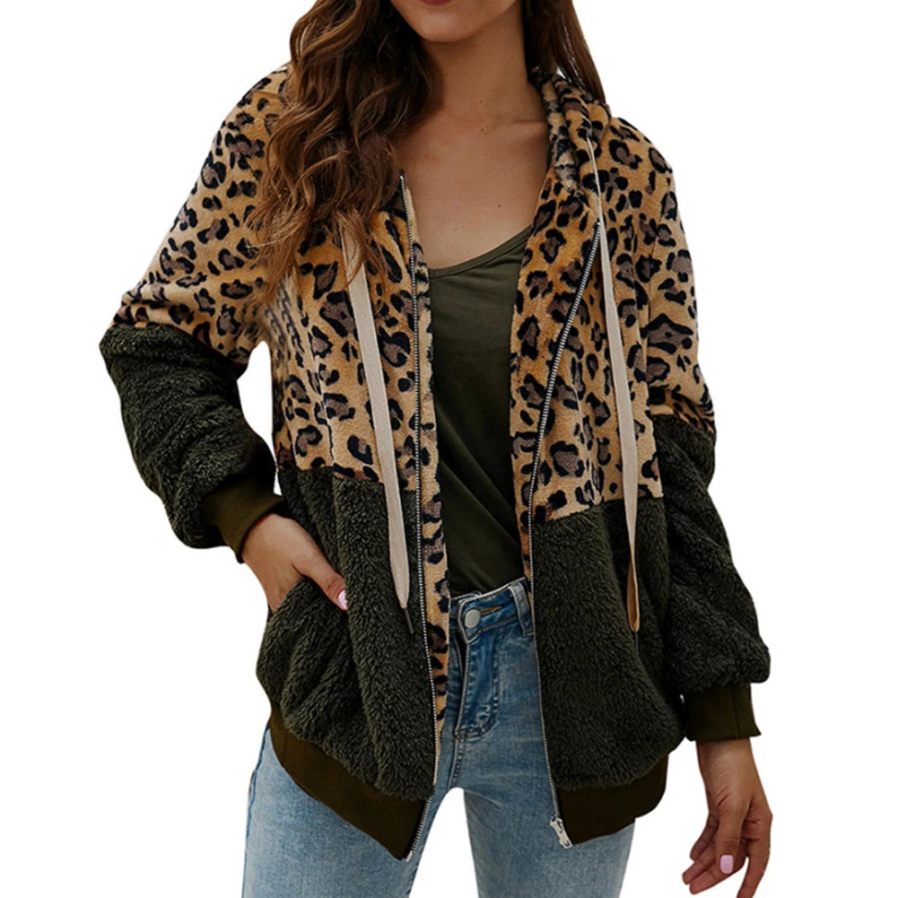 Зимняя куртка на молнии из искусственного меха с леопардовым принтом, женское теплое пальто с капюшоном и длинным рукавом
