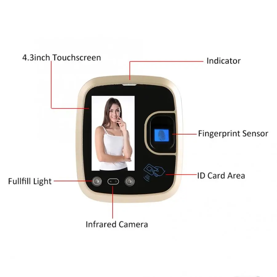 4,3 дюймов TFT TCP/IP 125 кГц RFID распознавание отпечатка лица карты посещаемости машины контроля доступа 100-240 В