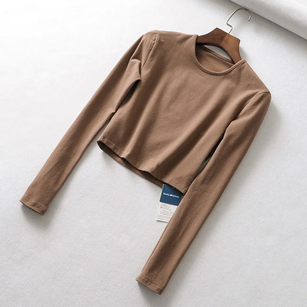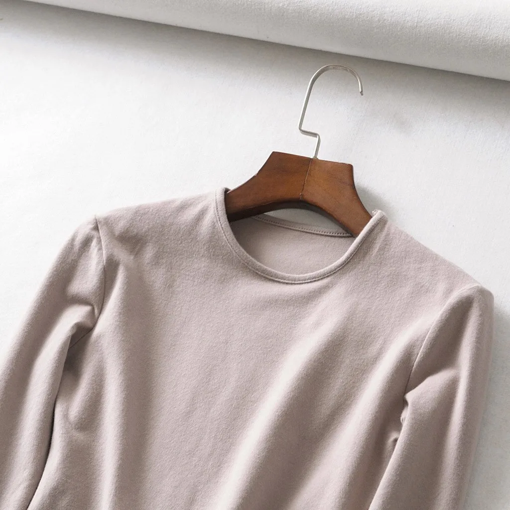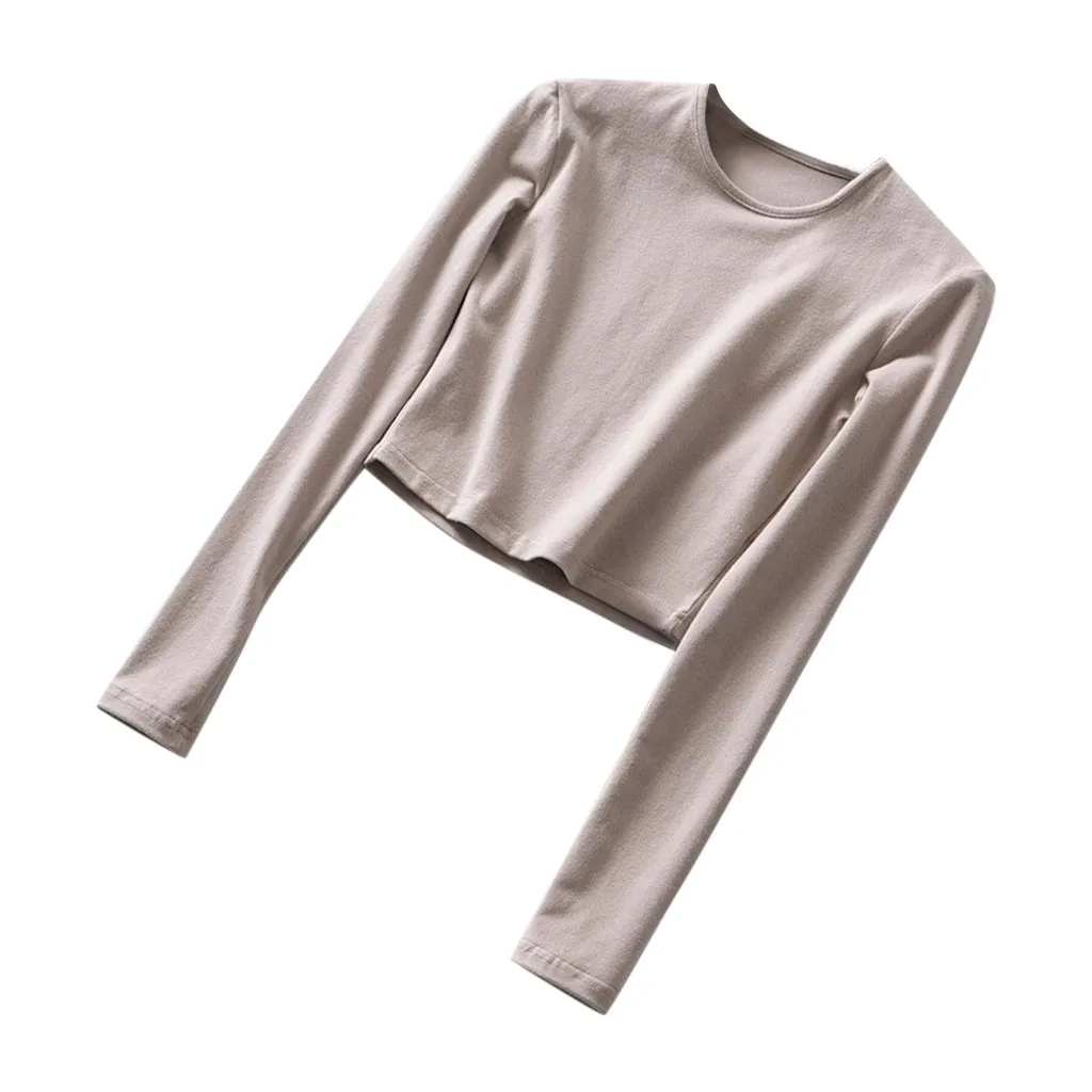 Модный женский теплый однотонный топ с круглым вырезом и длинным рукавом, повседневный спортивный топ с эластичной спинкой