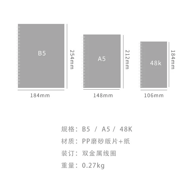 * Тип: записная книжка * Страницы: 180 страниц * Размер: B5-254 * 184 мм A5-212 * 148 мм 48K-184*106 мм (прибл.) * Вес: B5-400g A5-275g 48K-165g (прибл.) * Модель: B5:YF18-080 A5:YF18-081 48K:YF18-082 * Материалы: бумага + ПП * Внутренняя страница: горизонтальная линия * Биндер: биметаллическая катушка * Цвет: четыре цвета, как показано на изображениях. * Металлический блокнот с двойной катушкой, тонкая ПП Матовая Обложка, горизонтальные внутренние страницы. * Высококачественная бумага, гладкое письмо и без чернил. Примечание: для каждой модели есть четыре цвета на выбор, если нет указания при размещении заказа, мы доставим по одному случайному. (цвета как показано на фотографии).