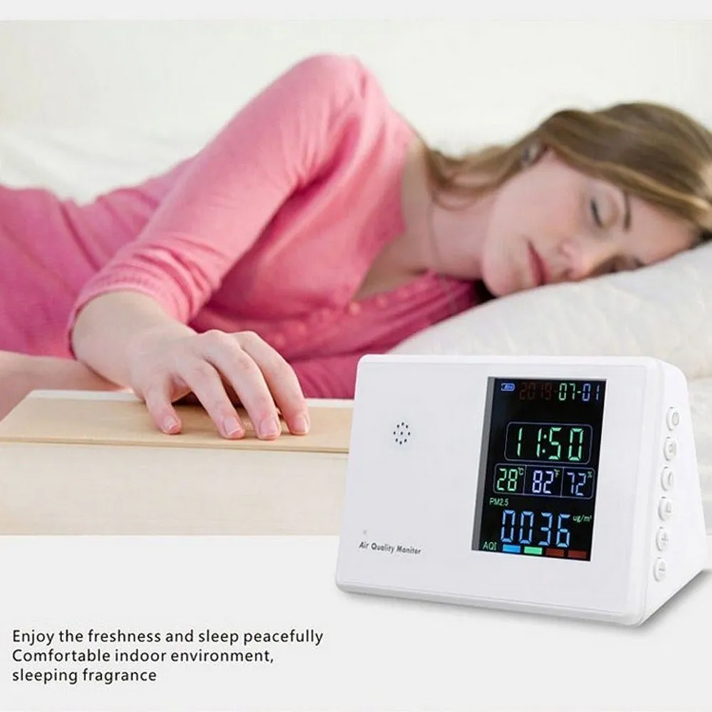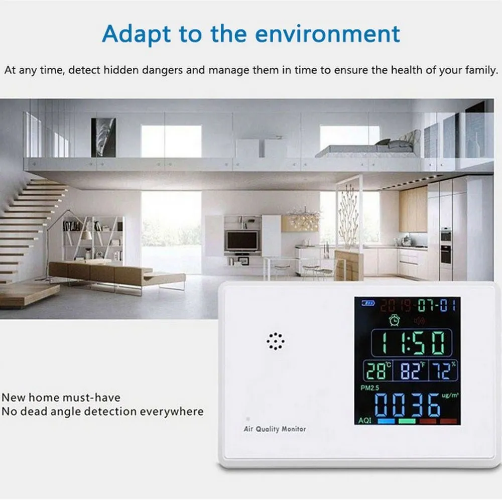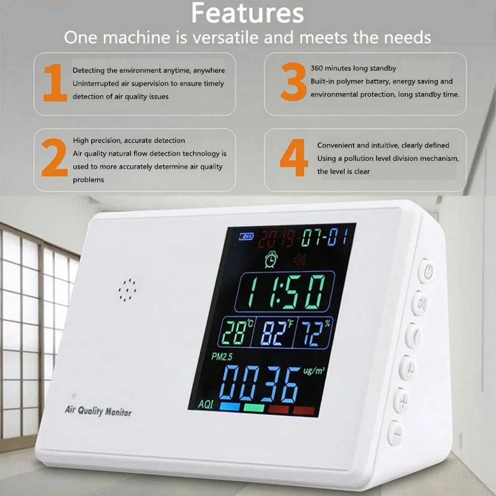 2. Может обнаруживать HCHO/TVOC/CO2/PM2.5/PM10/температуру/влажность, может также устанавливать время диаплей, будильник и календарь.