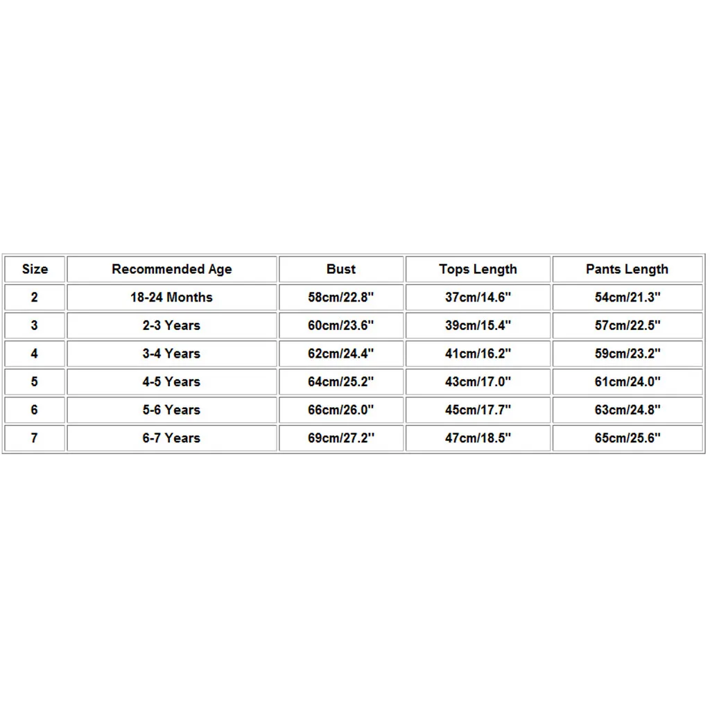 Размер Рекомендуемый возраст Бюст Длина топа Длина брюк 2. 18-24 месяцев 58 см/22,8" 37 см/14,6" 54 см/21,3" 3. От 2 до 3 лет 60 см/23,6" 39 см/15,4" 57 см/22,5" 4. От 3 до 4 лет 62 см/24,4" 41 см/16,2" 59 см/23,2" 5 От 4 до 5 лет 64 см/25,2" 43 см/17,0" 61 см/24,0" 6 От 5 до 6 лет 66 см/26,0" 45 см/17,7" 63 см/24,8" 7 От 6 до 7 лет 69 см/27,2'' 47 см/18,5" 65 см/25,6"