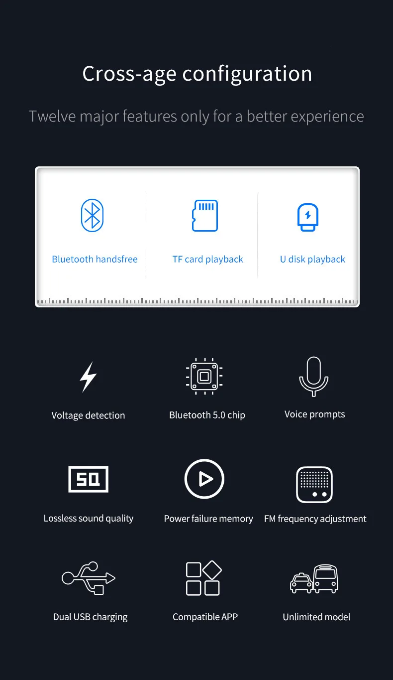 Одна кнопка для активации превосходного звука (басов). Оснащен двойной режим Bluetooth 5,0 чип, интегрированный 32-бит MCU + DSP процессор и 32-бит аудио кодек, Совместимость с Android, для системы Apple. Обработка фонового шума, делает мобильный телефон более четким и автомобильным музыкальным эффектом.