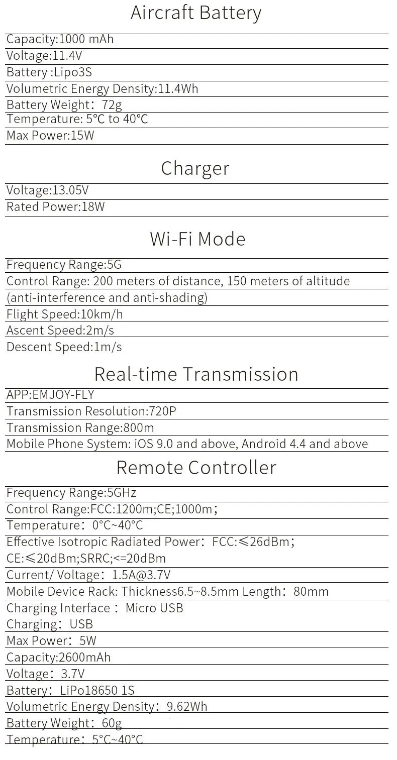 2. 5G WIFI FPV. 1080P videos and photos, 720P real-time transmission. 120° Wide-angle Lens ,0-90° adjusts the camera,: 1920*1018 High Resolution Images