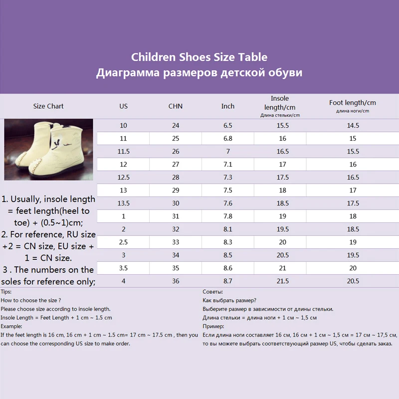 NOTE: When you choose size please check our size chart because the size table is not standard. So please choose size according to the "FOOT LENGTH".Find the foot length you need,then find the corresponding US SIZE or CHN SIZE for making order.