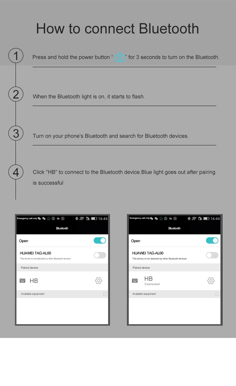 1: долго нажмите кнопку питания пульта дистанционного управления Bluetooth, 3 секунды, чтобы включить Bluetooth